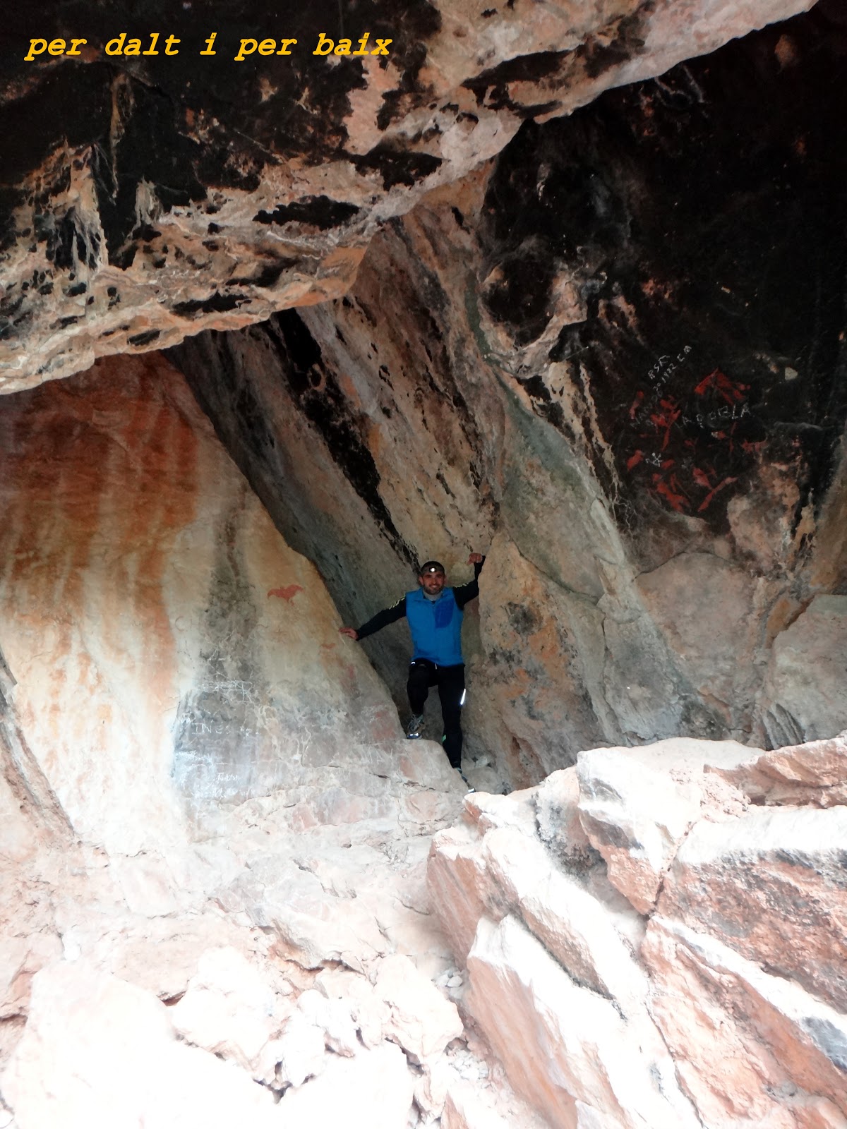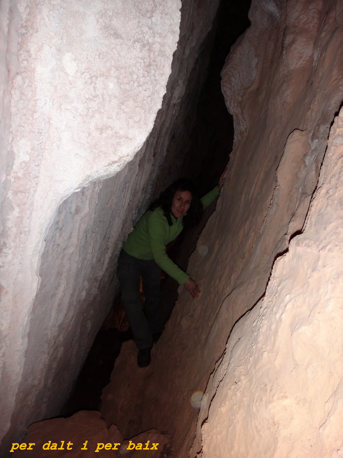 Como nos advirtió Xavier, salir no fue empresa fácil, como no tenemos material especifico de espeleo, pues lo hicimos como escalando en "top rope", y aprovechando las contadas presas que hay para agarrarse -no contaba con ello, pero que bien hubiese venido llevar alguna cinta con la que improvisar un estribo- , una vez fuera nos damos cuenta, que entre la charla con Xavier y Luis y la visita a la cueva hemos estado allí cerca de dos horas -cuando se está bajo tierra el tiempo pasa volando-, así que pegamos un bocado rápido y apretamos el paso, puesto que nos queda otra cueva por visitar, la Cova Negra.