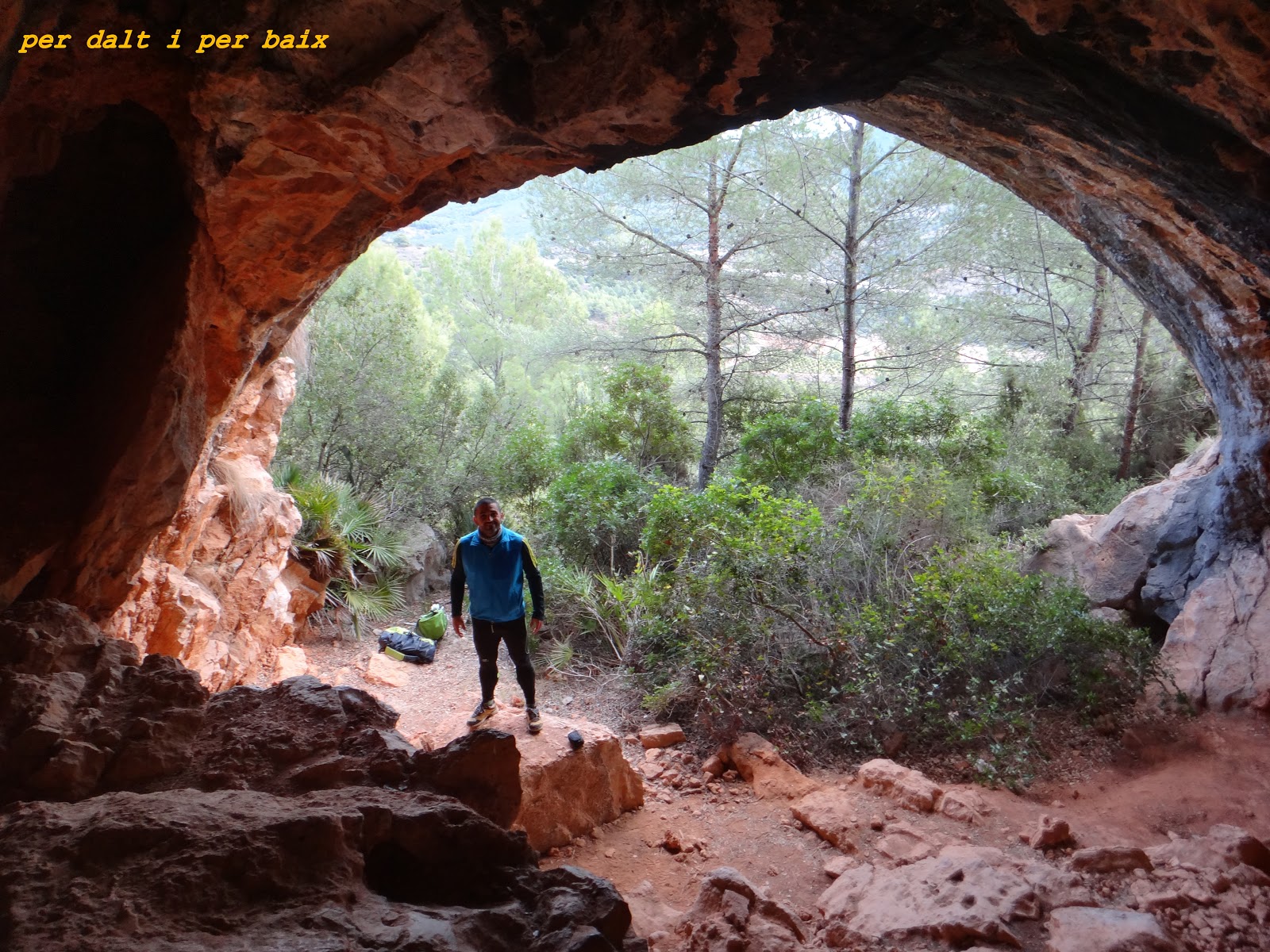Salimos desde la Pobla Tornesa y enseguida nos enfilamos a la senda que sube al Tossal de la Vila, donde disfrutamos de buenas vistas, des de ahí, y después de pasar por la Penya Roja, llegamos hasta la Cova dels Malandrins, donde para bajar hay que llevar material para rapelar, la boca de la cueva es pequeña, pero la sala que encontramos es bastante grande y con muchas formaciones.