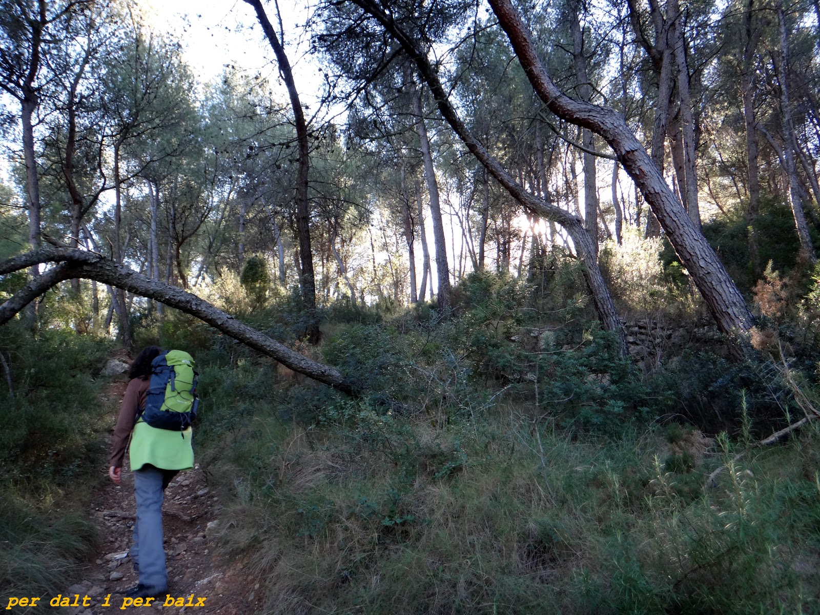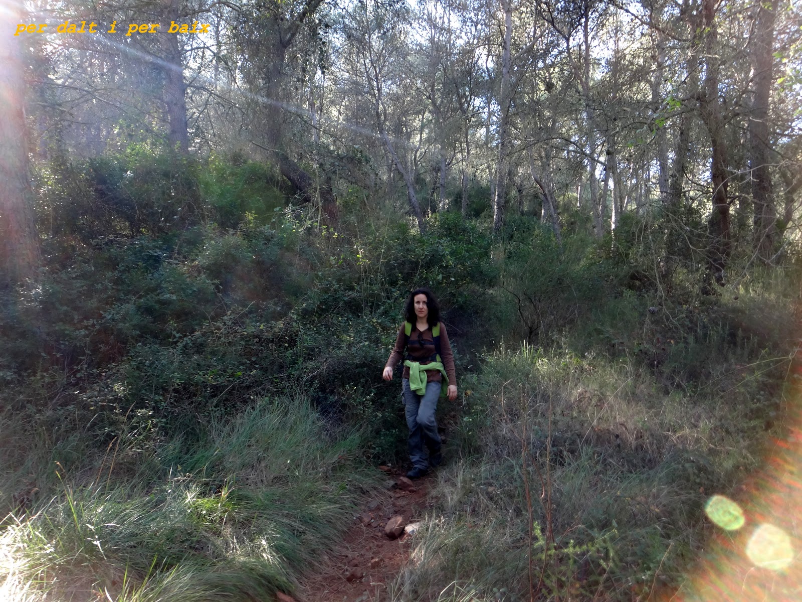 Volvemos al anteriormente mencionado campo de almendros, allí tomaremos un camino que nos enlazará con el Camí del Mas del Alt, el cual abandonaremos al instante para tomar una bonita y frondosa senda que nos encaminará hacia el Barranc del Pou de la Figuera y que luego continuará paralela a él, como digo, la frondosidad del bosque es tal que no permite la entrada de la luz del sol, que en ese momento brilla en lo más alto, se hace agradable caminar por ahí, esta ruta además de tener el aliciente de visitar dos cuevas tiene tramos realmente bonitos como este, aunque no entréis en ellas, vale la pena mucho hacerla, en serio.