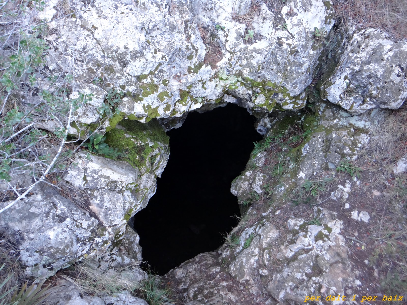 Por terreno calcáreo de nuevo, llegamos a la pequeña boca de entrada de la Cova dels Malandrins, ya estuvimos por aquí a principios de año, pero no pudimos bajar por no llevar el material necesario, pero esta vez si que veníamos armados con la cuerda y los arneses.